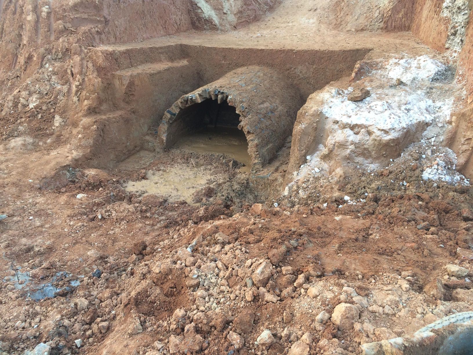 古墓是在進行1#地下室土方開挖作業(yè)時發(fā)現(xiàn)的,中鐵二十局集團有限公司施工人員在使用反鏟挖掘機開挖1#地下室第二層土方時鏟斗破開了古墓的拱頂,古墓內(nèi)部流出了大量的積水,但因頂部構造相似,當時未能確定是古墓還是舊人防設施。